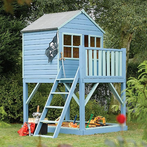 The Tree Tops Playhouse is made from 12mm T&G shiplap cladding a T&G pine wood floor and a solid boarded roof. It even comes with a ground floor sandpit area for added fun in the sun.
